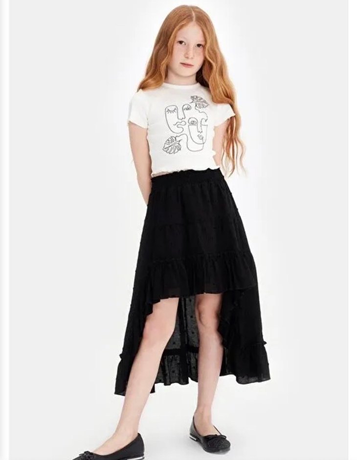 Pamuk kumaştan, bol kesim kız çocuk eteği, fırfırlı etek ucu ve koyu renk batik desenlidir. Trend sokak stili için uygundur.