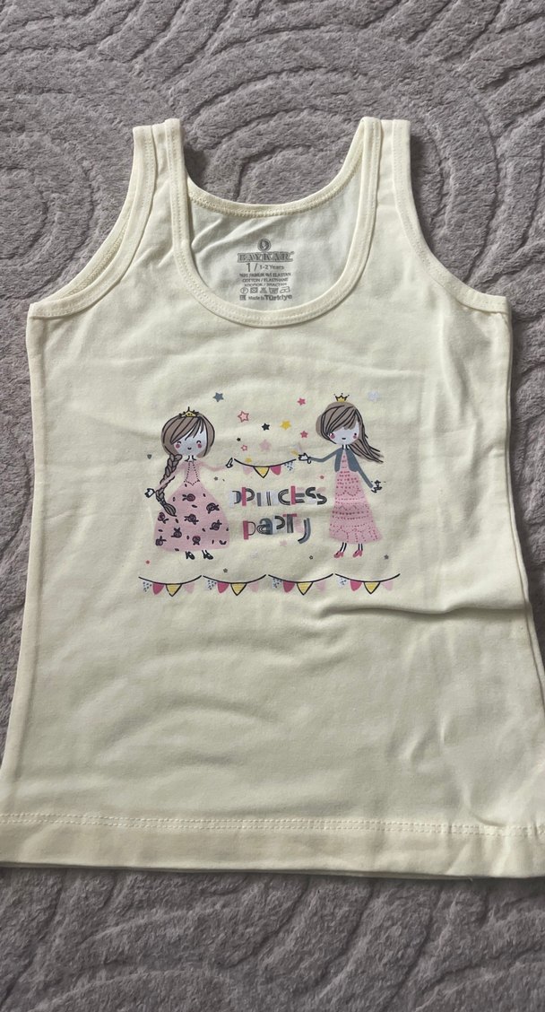 Pamuklu, bisiklet yaka, fitted kesim kız çocuk atlet. Pastel renklerde iki kız figürlü baskı ve eğlenceli yazı içerir. Rahat ve yumuşak kumaşlı.