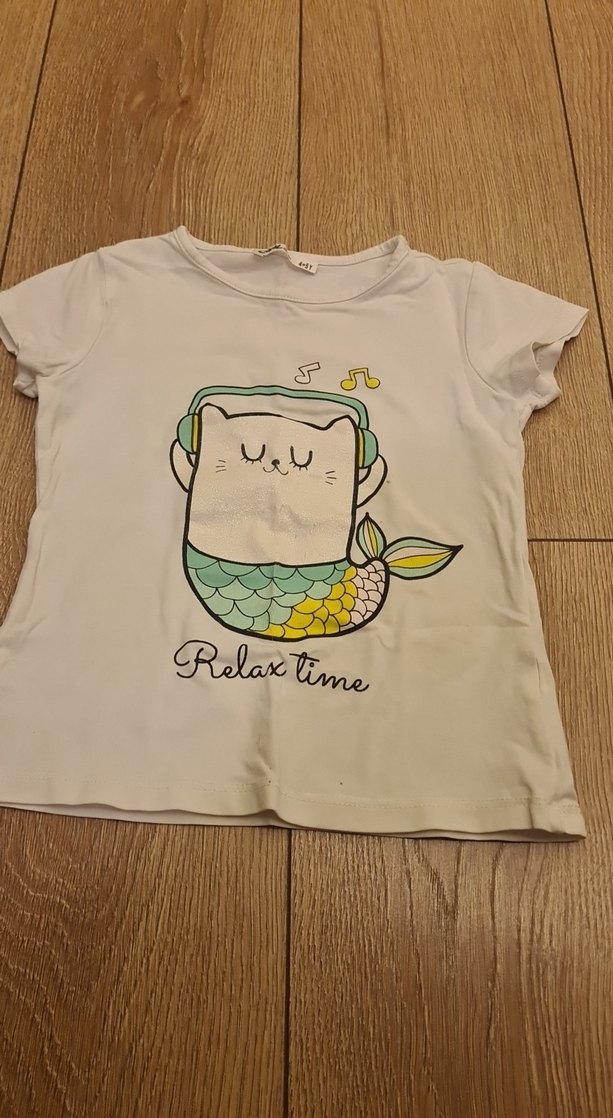 Kız çocukları için pamuklu, kısa kollu, bisiklet yaka, bol kesim tişört. Üzerinde kulaklıklı kedi ve "Relax time" yazısı bulunan renkli baskı mevcuttur.