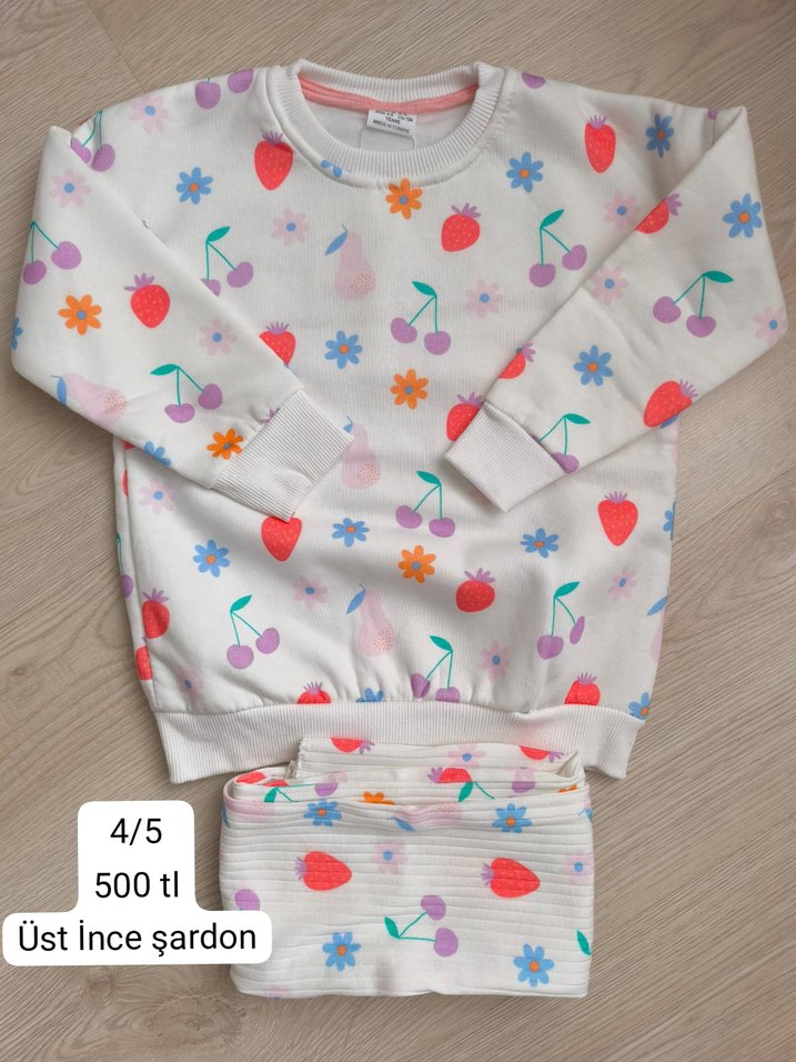 Kız çocukları için pamuklu, ince örme kumaştan, uzun kollu, baskılı, rahat kesim beyaz sweatshirt. Çilek, kiraz ve çiçek desenleriyle pastel renklerde, günlük kullanıma uygun.