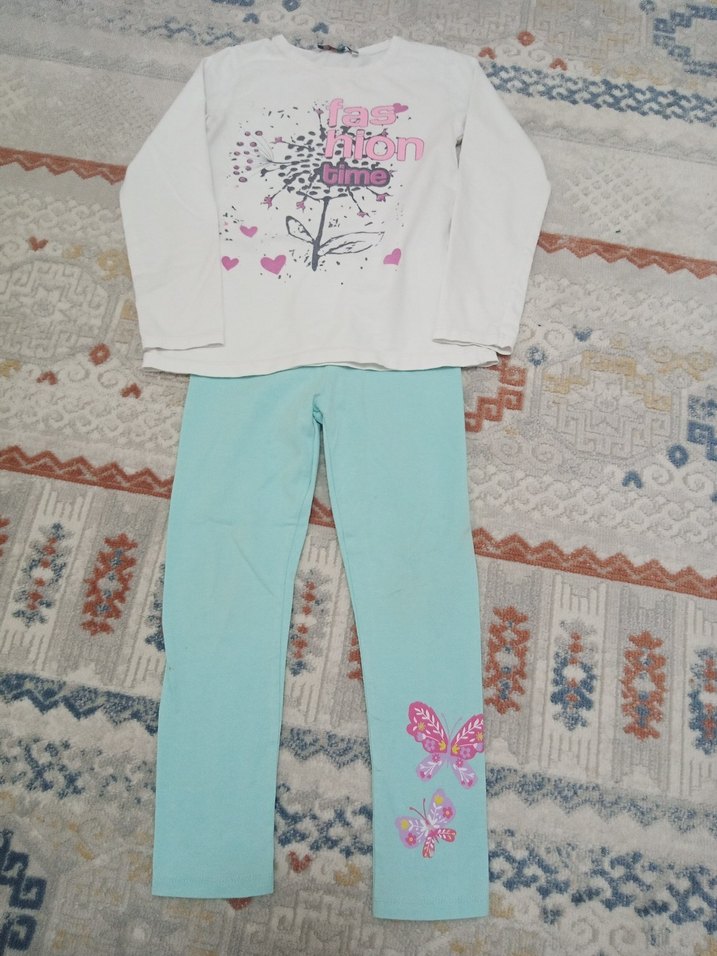 Beyaz, uzun kollu, örgü dokulu üstü baskılı ve yuvarlak yaka olan, bol kesim açık mavi renk kelebek desenli kız çocuk eşofman takımı.