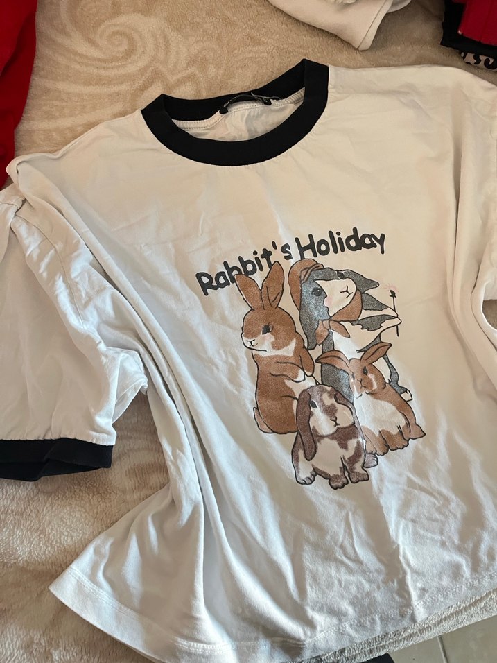 Kız çocukları için pamuklu, kısa kollu, salaş kesim tişört. Tavşan baskılı ve koyu renk yakasıyla rahat sokak stili için uygun.