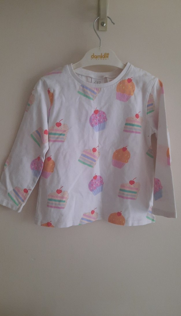 Beyaz pamuklu kumaştan, pastel renkli cupcake ve pasta baskılı kız çocuk uzun kollu tişört. Yuvarlak yaka, bol kesim ve düğme detaylı. Sokak stiline uygun.