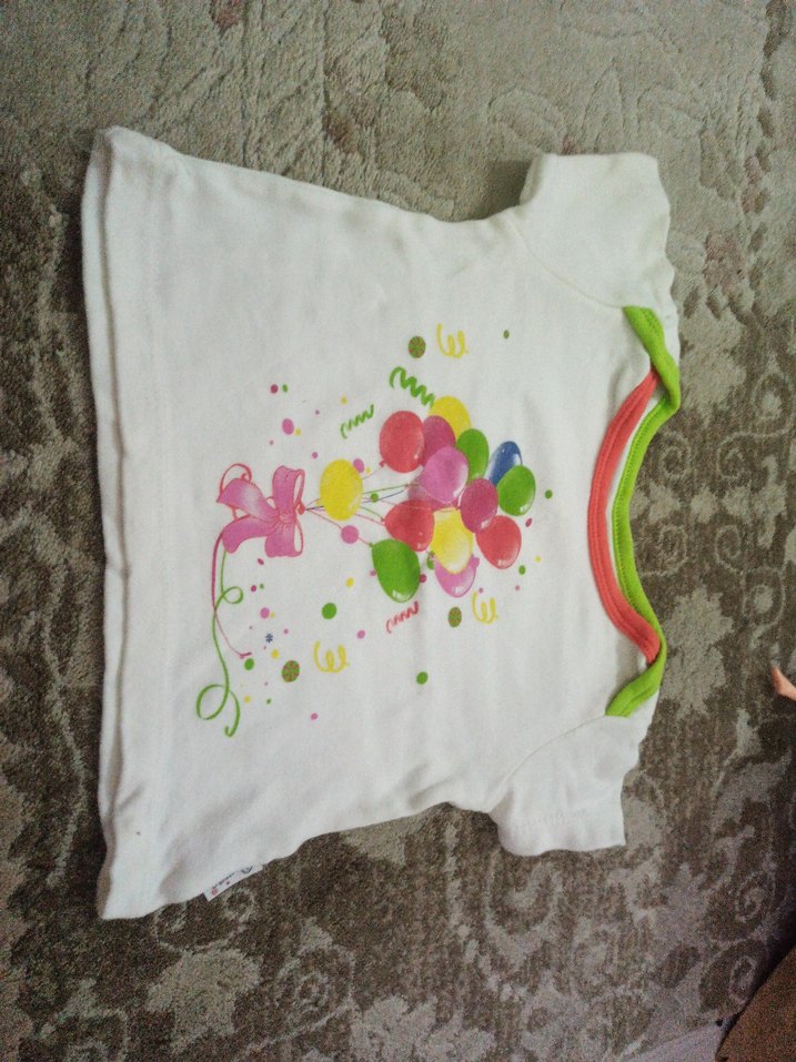Kız çocuk tişörtü, kısa kollu ve bisiklet yaka. Renkli detaylar ve canlı balon baskısı bulunan bol kesim yumuşak kumaş.