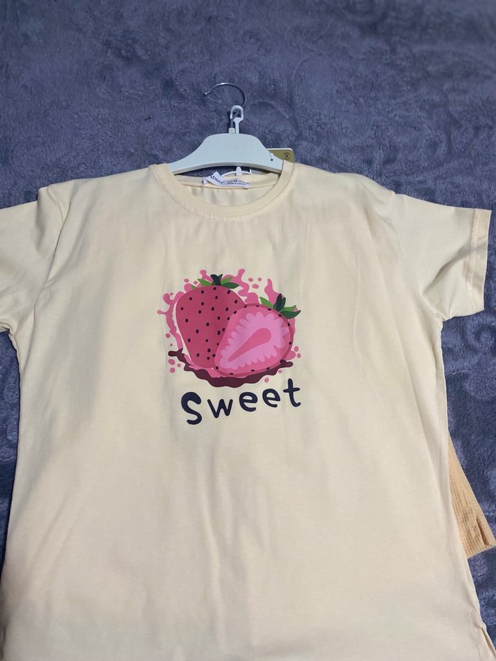 Beyaz pastel renkte, kısa kollu ve yuvarlak yakalı kız çocuk tişörtü. Örgü yapıda, bol kesim ve üzerinde "Sweet" yazılı çilek baskısı bulunur.