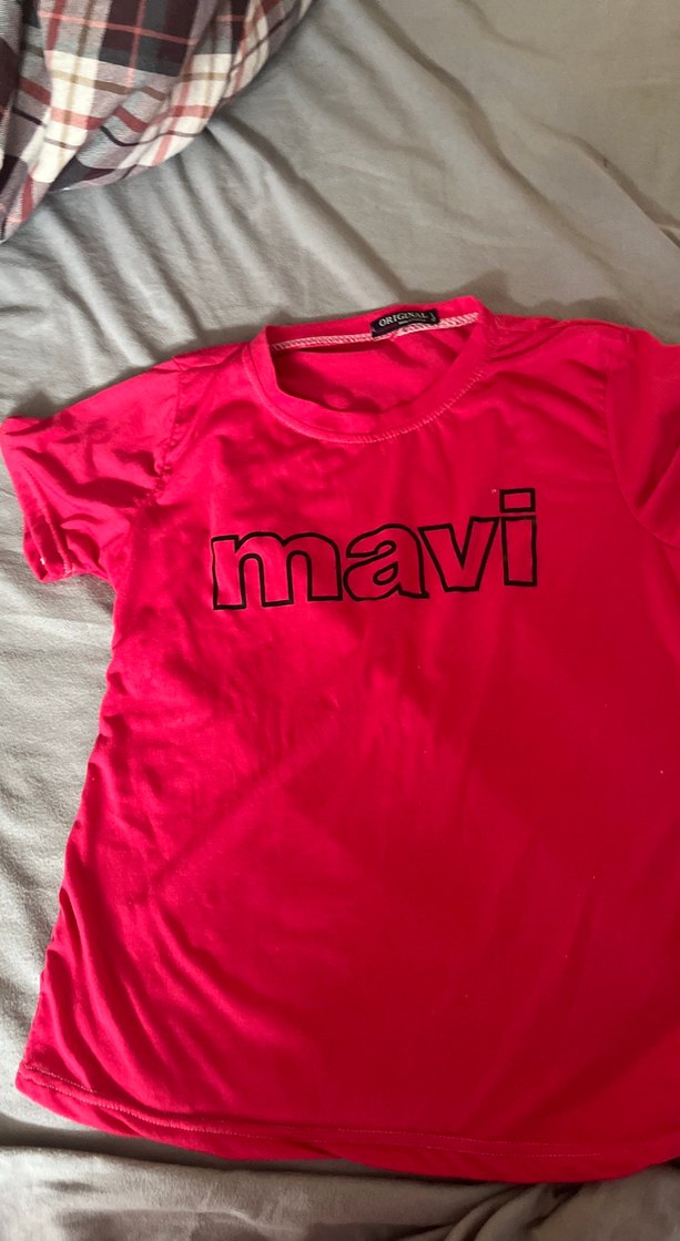 Dar kesim, kısa kollu pembe kız çocuk tişörtü, yuvarlak yaka ve önünde 'mavi' baskısı bulunan yumuşak dokulu kumaştan.