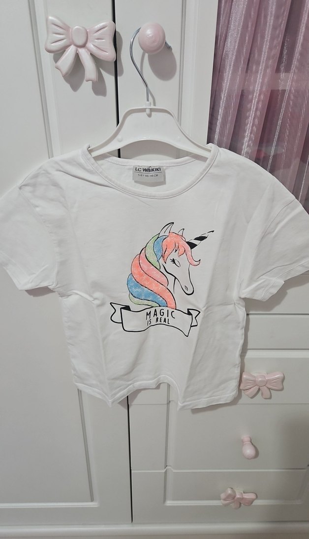 Pamuk kumaştan, kısa kollu beyaz tişört, bol kesim ve bisiklet yaka. Renkli unicorn baskısı ile şık ve rahat.