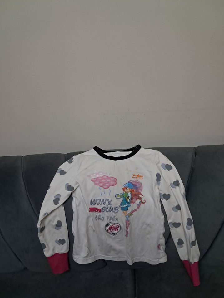 Kız çocukları için pamuklu, örme kumaştan, baskılı desenli ve kalp desenli kolları olan, bol kesim uzun kollu tişört. Gri, beyaz ve pembe renkler içerir. önünde lekeler var, giymeye engel değil, beden yazmıyo, tahmini yazdım yaşı, ölçüleri verdim