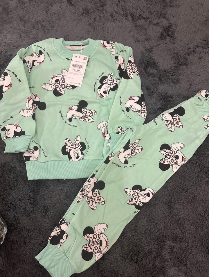 Baskılı Minnie Mouse desenli, yeşil renkli, bol kesim kız çocuk eşofman takımı. Yumuşak, örme kumaştan, uzun kollu ve bisiklet yaka olarak tasarlanmıştır.