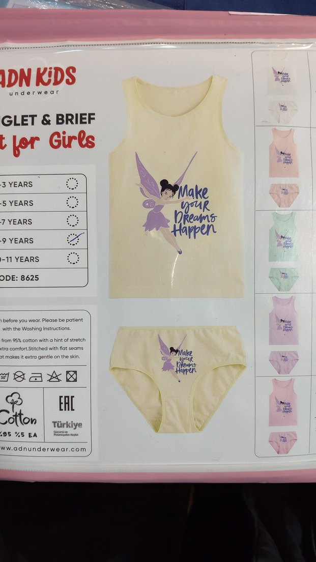 Kız çocukları için pamuklu, açık renkli atlet ve külot takımı. Üzerinde "Make your dreams happen" yazılı peri baskısı bulunur. Birden fazla beden seçeneği mevcuttur. 4,5 ve8,9 yaşları mevcut♀️