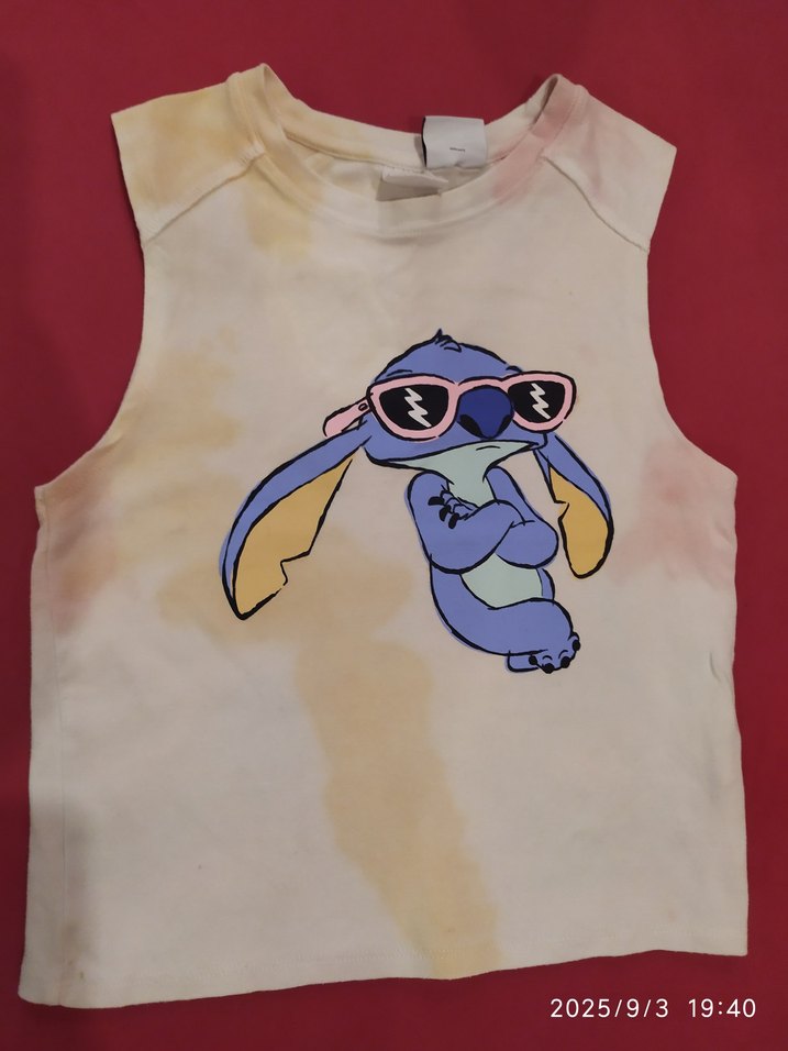 Çocuklar için pastel batik desenli, önünde güneş gözlüklü sevimli bir çizgi film karakteri bulunan kolsuz tişört