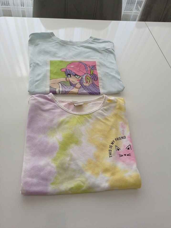 Kız çocukları için pamuklu, kısa kollu, yuvarlak yaka, bol kesim tişört. Çok renkli pastel batik desenli ve baskılı, rahat sokak stili için uygun.