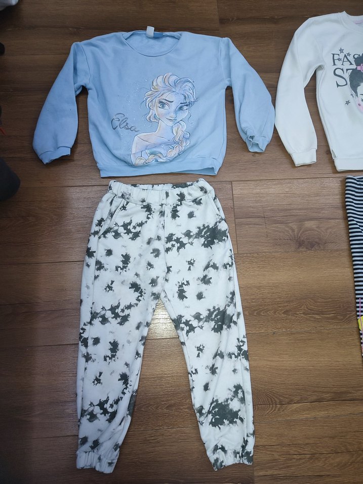 üc parça 7/8 yaş için uygun / sağ alttaki çizgili tayt 4/5 yaş için uygun hepsi 4 parça gönderilecektir.beyaz kazağın köşe kısmında ufak bir sökük var son resimde işaretleyerek gösterdim Gri beyaz batik desenli bol kesim kız çocuk eşofman altı, mavi uzun kollu bisiklet yaka, örgü detaylı sweatshirt ile kombinlenmiştir. Rahat sokak giyimi için uygun.