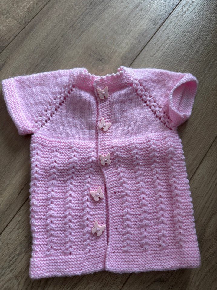 Kız çocuklar için pembe kısa kollu, fitted vintage tarzı örgü hırka. Yumuşak örgü kumaş, kelebek şeklinde düğmeler içerir.