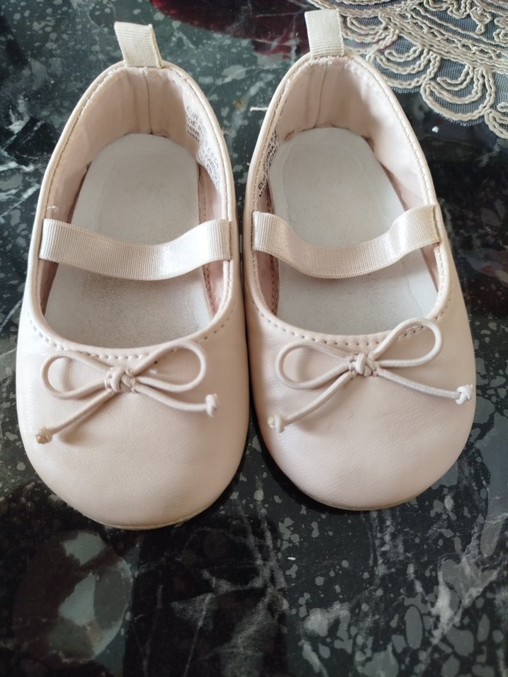 Bej renkte, fiyonk detaylı ve lastikli kayışlı kız çocuk babetleri. Pastel tonlarda, desensiz ve modern klasik tarzda.