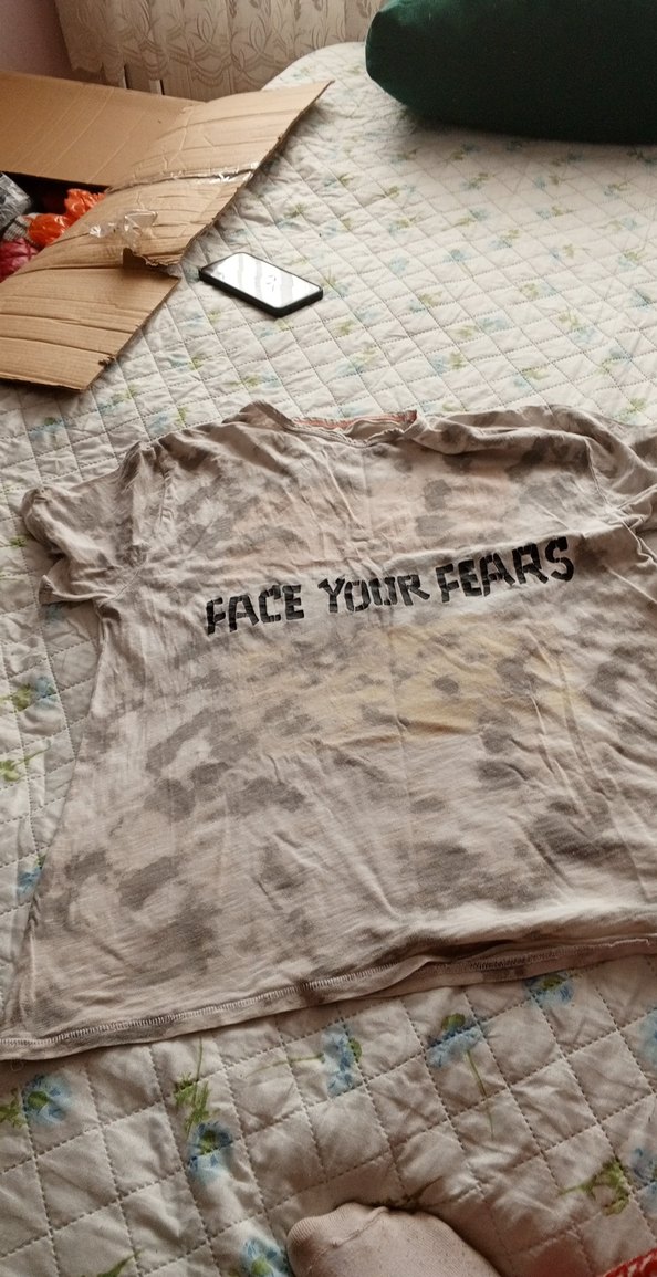 Keten kumaştan, bol kesim kız çocuk tişörtü. Yuvarlak yaka ve kısa kolludur. "FACE YOUR FEARS" baskılı, rock punk tarzında pastel bej renktedir.
