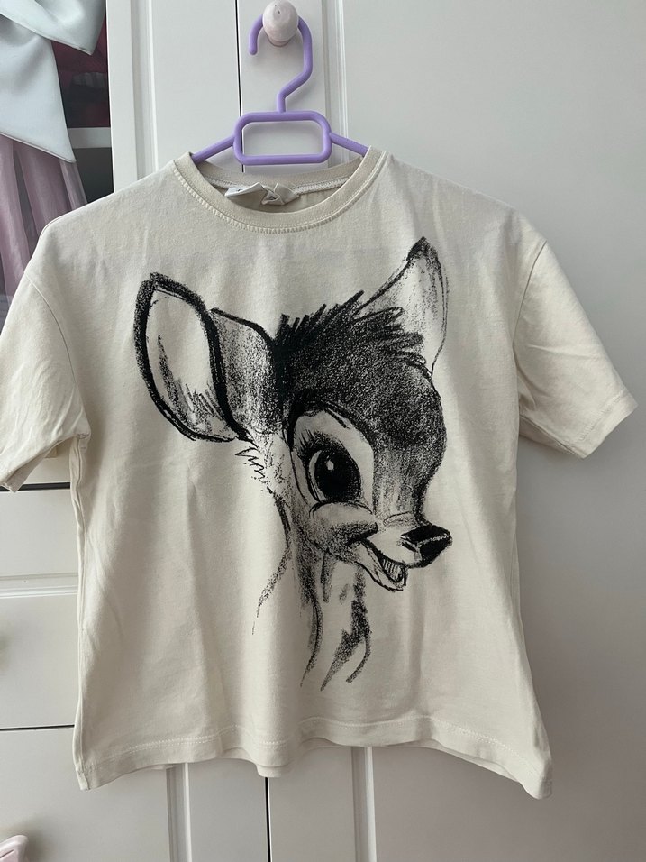 Kız çocukları için bej renkli, pamuklu kumaştan kısa kollu ve bol kesim tişört. Yuvarlak yakalı ve baskılı geyik deseni ile günlük sokak stiline uygun. Temiz sıkıntısız ürün