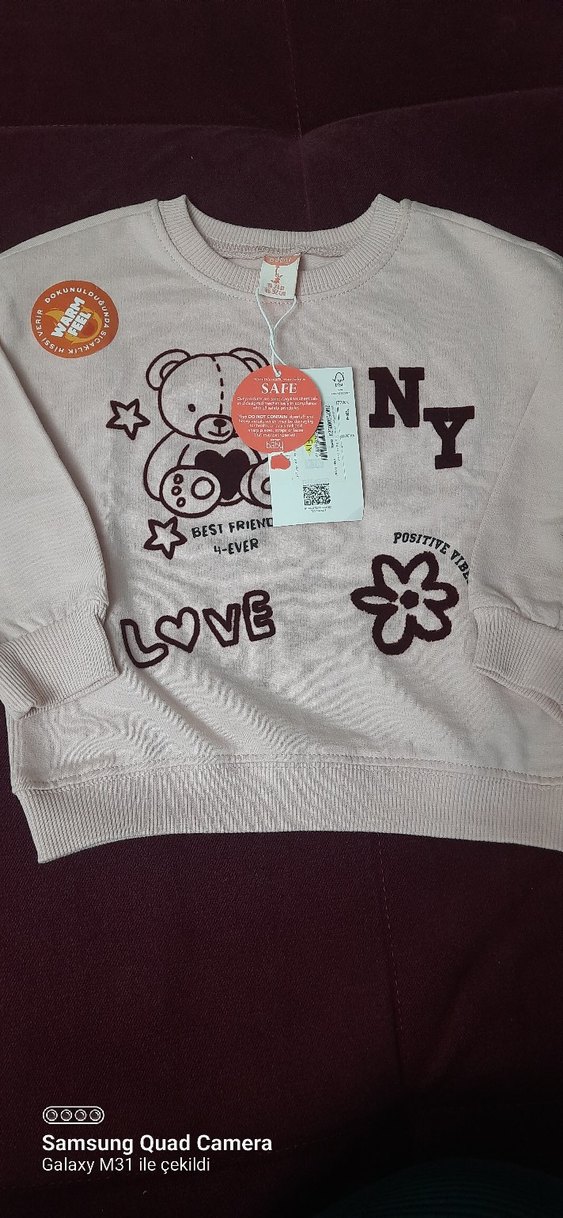 Bej ve gri tonlarda, uzun kollu ve yuvarlak yakalı kız çocuk sweatshirtü. Baskılı ayı, yıldız ve "BESTFRIEN", "LOVE" yazıları bulunur. Düğmeli detaylı, rahat kesim ve yumuşak kumaşlı.