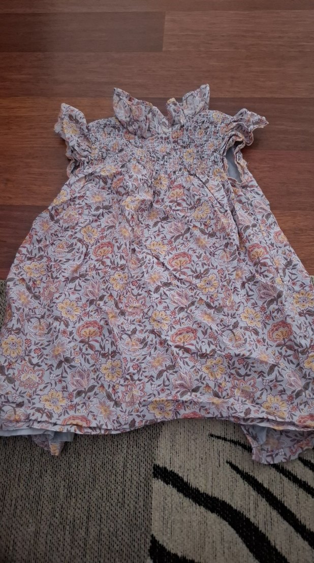 Kız çocukları için bol kesim, kolsuz, askısız yakalı ve drapeli tasarıma sahip elbise. Yumuşak kumaştan, pastel bej tonlarında tie-dye desenlidir.