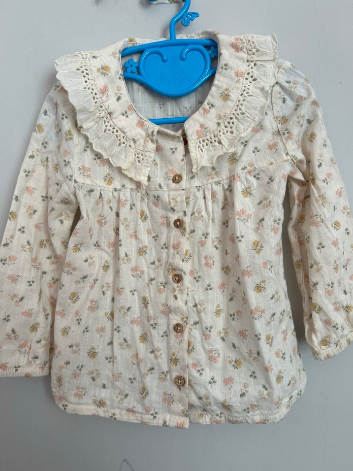 Etiketi yok kullanılmadı Pamuklu, uzun kollu, düğmeli ve yakalı bej renkli, çiçek desenli bol kesim kız çocuk bluz gömlek