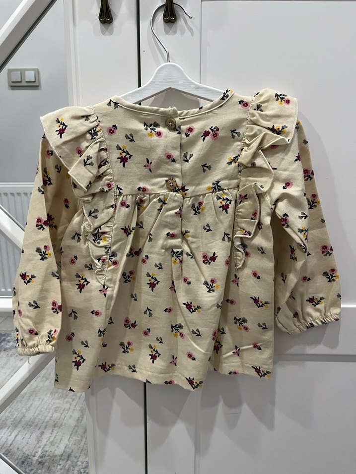 Bej renkli, uzun kollu kız çocuk bluzu, yuvarlak yakalı ve bol kesimdir. Çiçek desenli ve fırfır detaylıdır, bohem tarzını yansıtır.