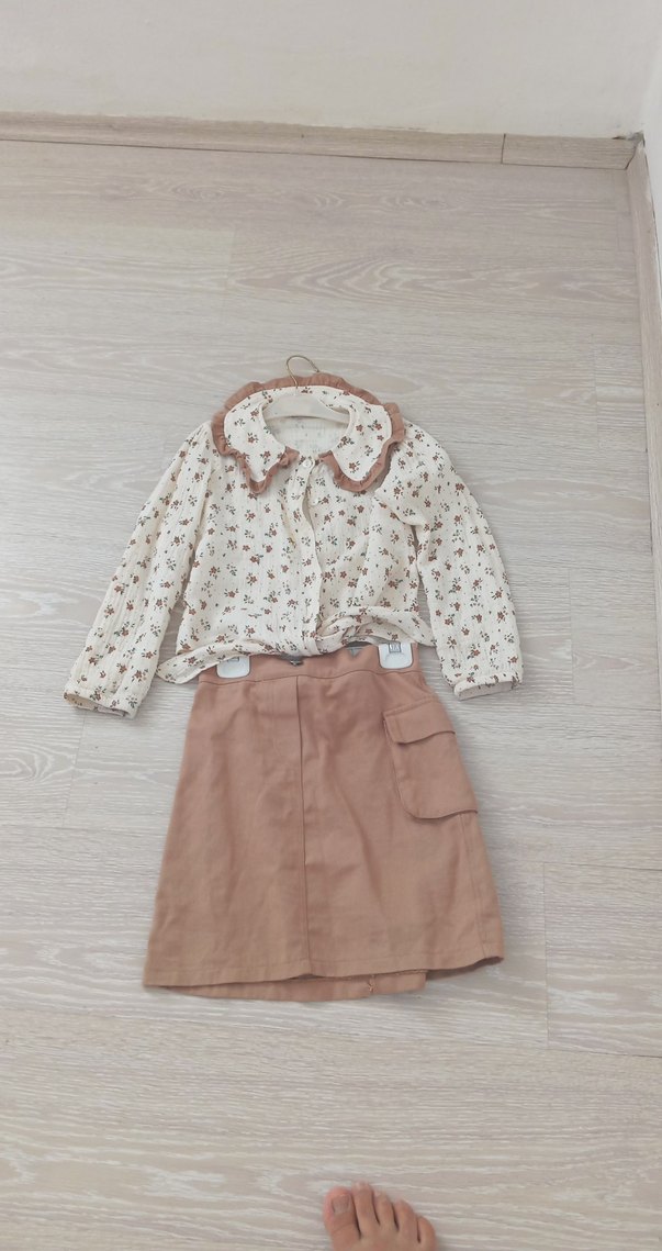 Pamuklu kumaştan, uzun kollu, yakalı ve düğmeli bej renkli çiçek desenli bol kesim kız çocuk gömleği. lekeler mevcut o yüzden uygun