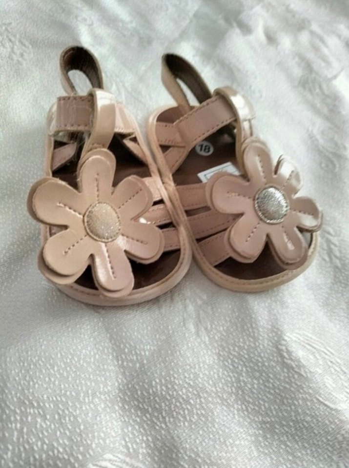 Kız çocukları için bej renkte, çiçek desenli, tokalı kayışlı kauçuk sandaletler, bohem tarzda.