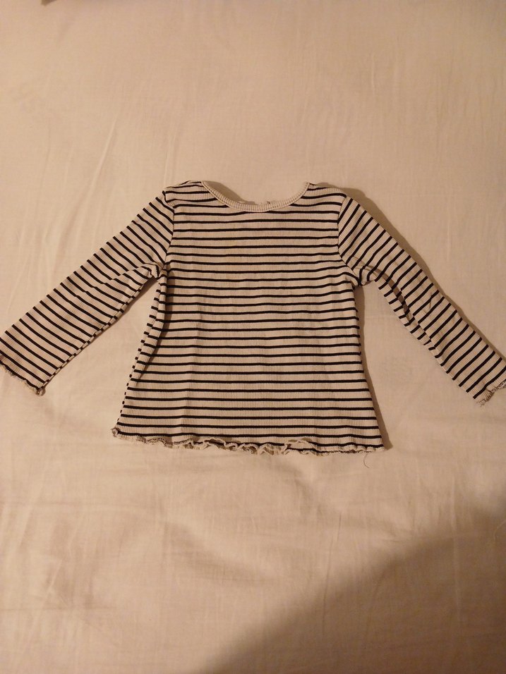 Kız çocuklar için uzun kollu, kayık yaka, bol kesim bluz. Yumuşak yün malzemeden, çizgili desene ve fırfır detaylara sahiptir. Bej renkli, koyu çizgili klasik tasarım.