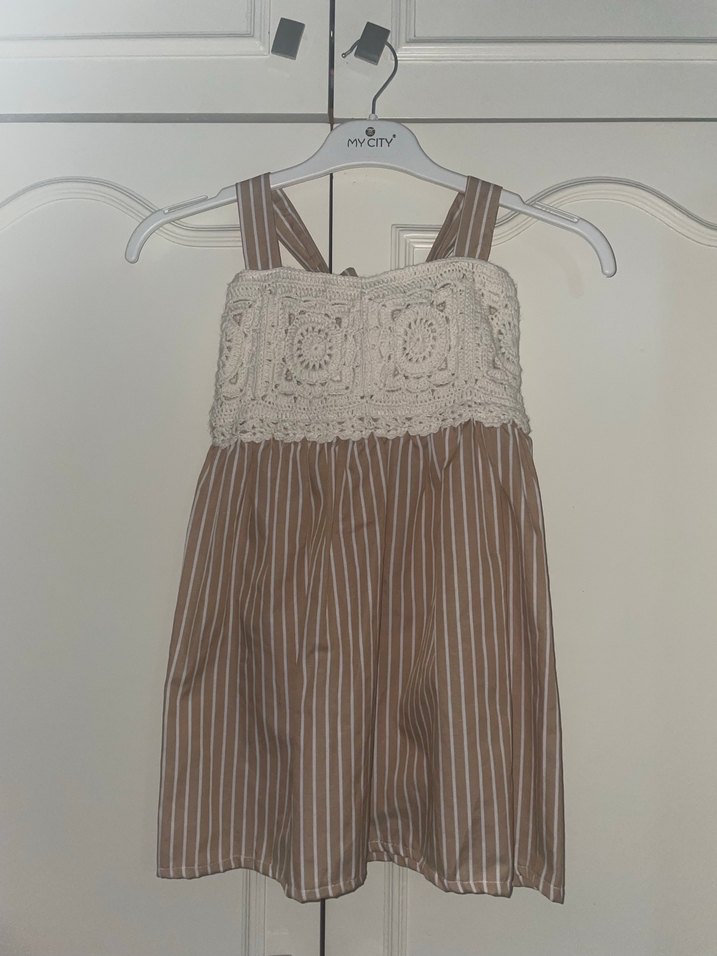 Askılı, dantel detaylı örme üst kısmı ve hafif bej çizgili etek kısmı ile bohem tarzda kız çocuk elbisesi.