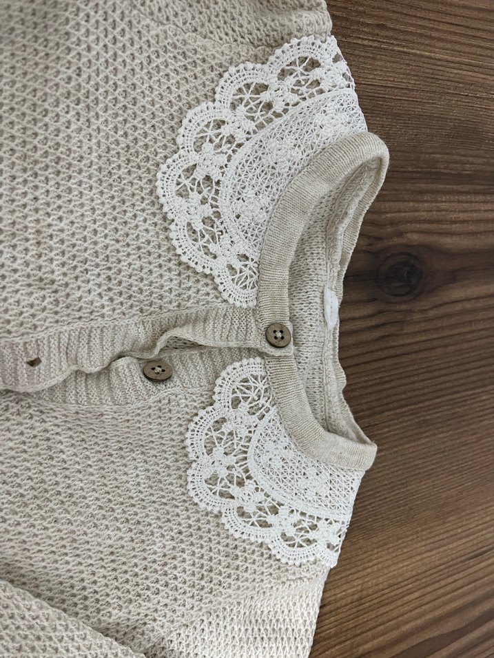 Uzun kollu, bol kesim bej renk kız çocuk örgü hırka. Bohem tarzı ve dantel işlemeli detaylara sahip, yumuşak ve nefes alabilir kumaş.