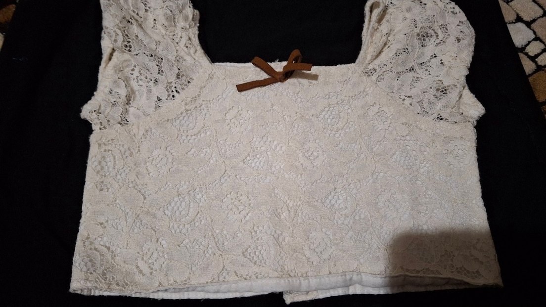 Kız çocukları için bej renkte, dantelli ve bohem tarzda, ince triko kumaştan yapılmış, tekne yaka ve askılı kollu dar kesim bolero.