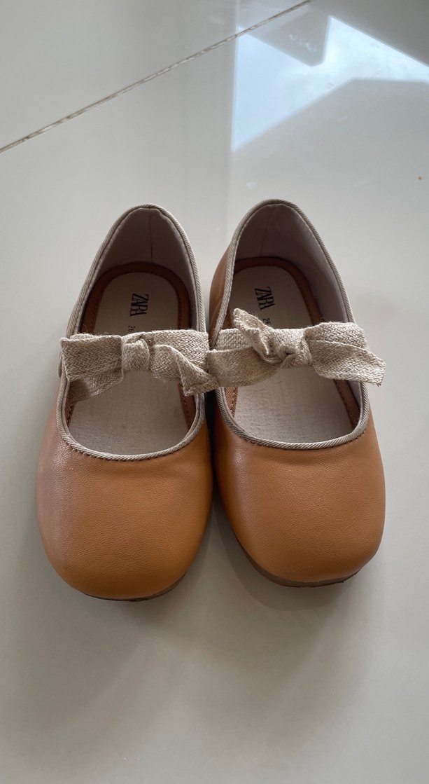 Taba renkli bej fiyonklu , deri kız çocuk babet ayakkabı. Pastel tonlarda fiyonk detaylı, sade ve desensiz, bohem tarzda. Bir defa giyildi