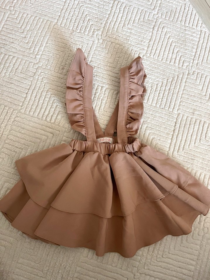 Bej renkli deri kız çocuk elbisesi, fırfırlı askıları ve bol kesimi ile. Askısız yaka ve bohem tarzda, klasik şıklık için uygun.