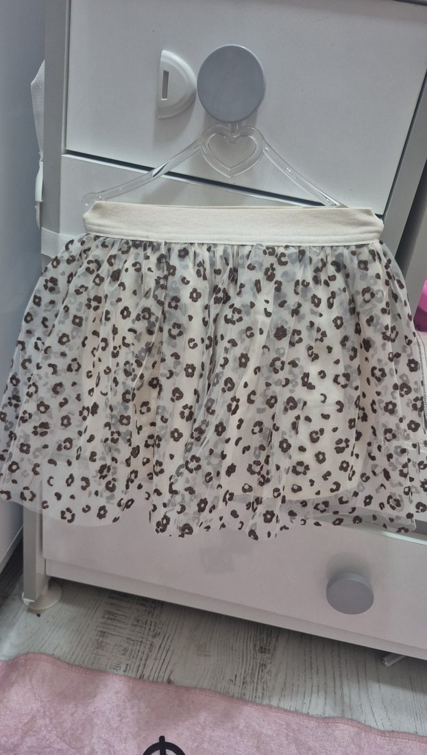 Sentetik kumaştan yapılmış, bej renkli, desenli ve fırfırlı kız çocuk eteği, rahat kesim ve sokak modasına uygun.