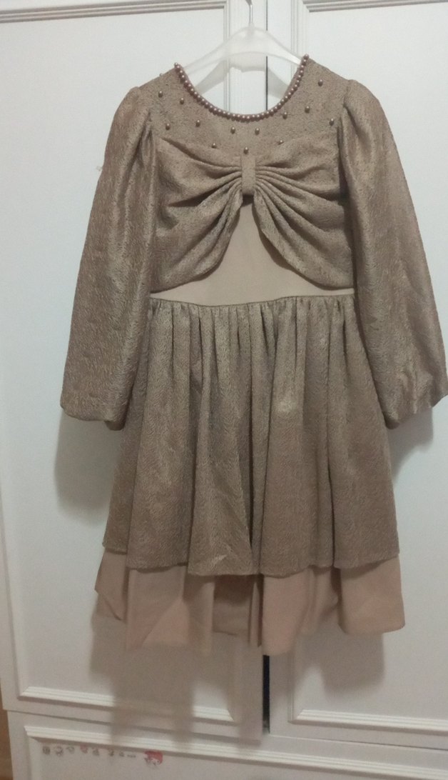 Bej renkli kız çocuk elbisesi, uzun kollu ve yuvarlak yakalıdır. Drapeli tasarımı ve bol kesimi modern klasik bir stil sunar. ✨