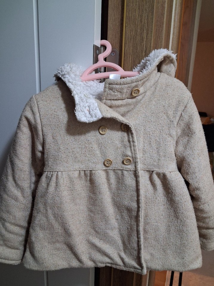 Bej renkli, düğmeli ve yakalı kız çocuk kabanı. Yumuşak ve sıcak kumaştan, bol kesim ve sade tasarımlı.