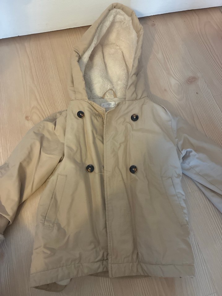 Bej renkli, düğmeli çocuk montu, kapüşonlu ve notched lapel yakaya sahiptir. Rahat kesimi ve yumuşak, sıcak kumaşıyla günlük kullanım için uygundur.