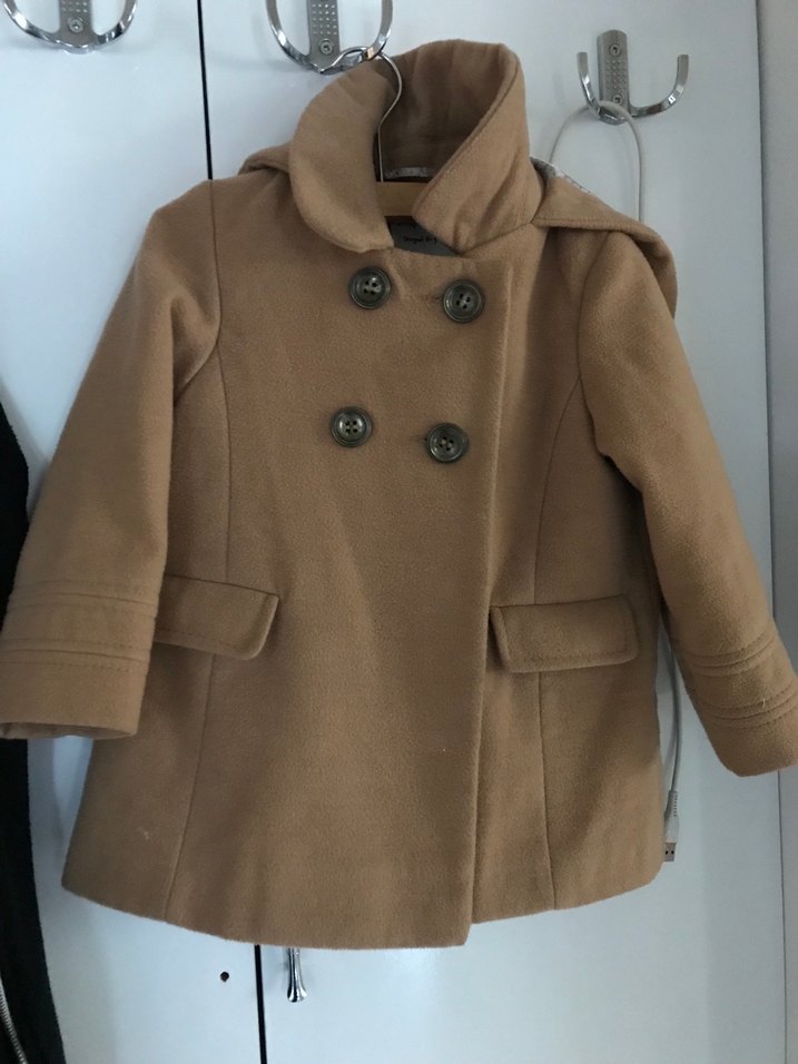 Kız çocukları için bej renkli, düğmeli ve yakalı kısa kaban. Yumuşak ve sıcak kumaştan, sokak stiline uygun sade tasarım.