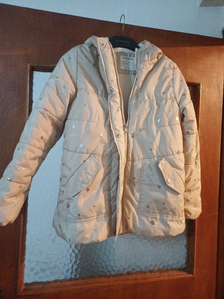 Kız çocukları için düğmeli, bej renkli, yumuşak ve sıcak kumaştan yapılmış, oturan kesim mont. Çentikli yaka ve sokak tarzı, yıldız desenli.