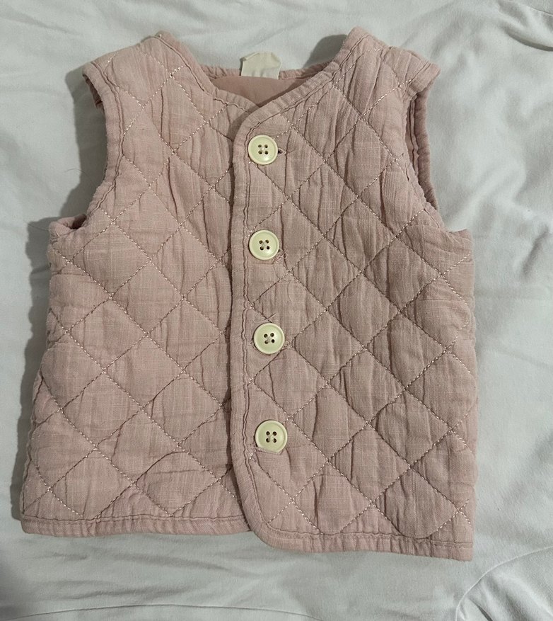 Kız çocukları için pastel bej renkli, düğmeli ve nakış detaylı kolsuz yelek. Yumuşak keten kumaştan üretilmiş, notched lapel yakalı ve bol kesimdir.