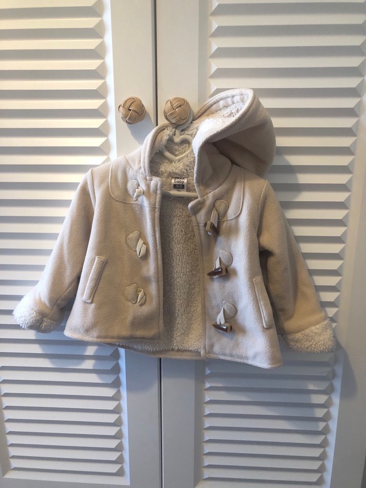 Kız çocukları için bej renkli, düğmeli ve yumuşak, sıcak polar kumaştan üretilmiş, klasik kesim normcore tarzında kapüşonlu ceket.