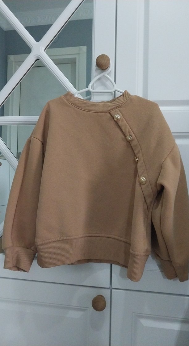 Bej renk kız çocuk sweatshirtü, uzun kollu ve yuvarlak yakalıdır. Ön kısmında düğme detayları bulunur, yumuşak ve sıcak kumaştan üretilmiştir.