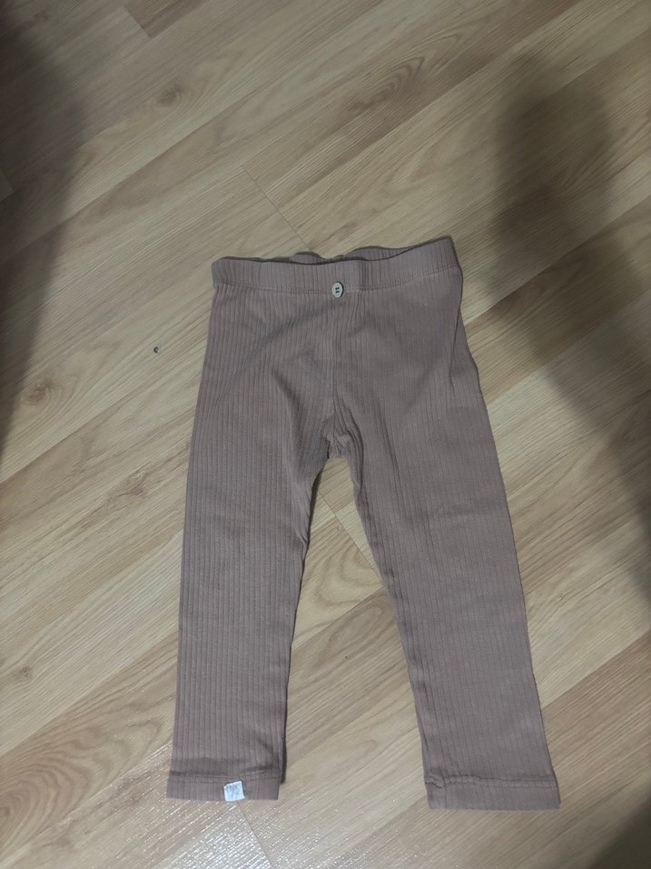 Yumuşak keten kumaştan yapılmış, beli düğmeli bej renk kız çocuk taytı. Rahat ve deseniz, günlük kullanıma uygun.