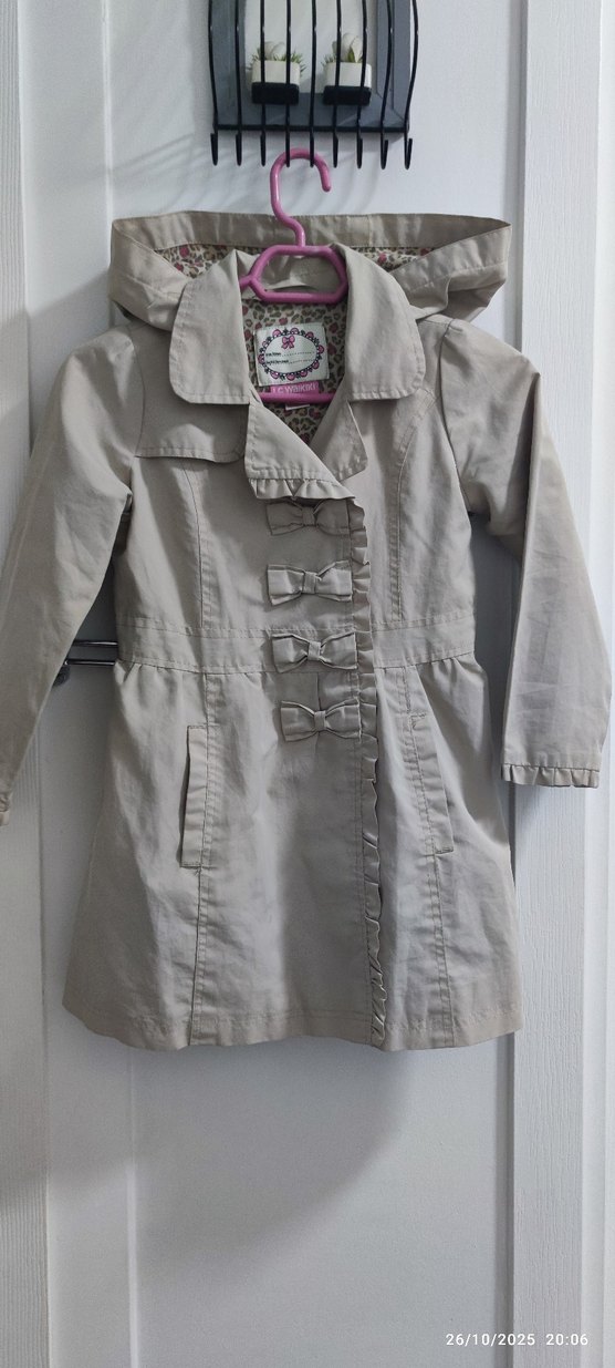 Bej renkli, düğmeli ve fiyonklu detaylı, oturan kesim kız çocuk trençkotu. Sentetik kumaştan, trend sokak stiline uygun.