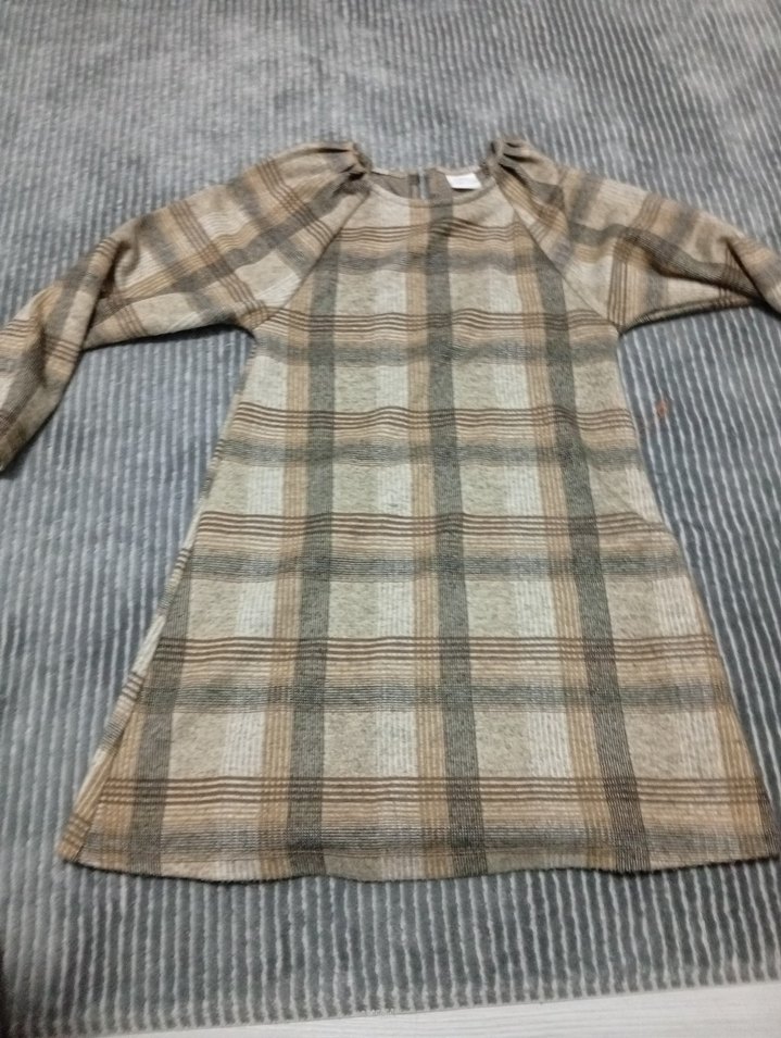 Kiz çocuk için uzun kollu, yuvarlak yakalı, bol kesim triko elbisedir. Yumuşak yün malzemeden yapılmış, bej ve gri ekose desene sahiptir, günlük rahat kullanım için uygundur.