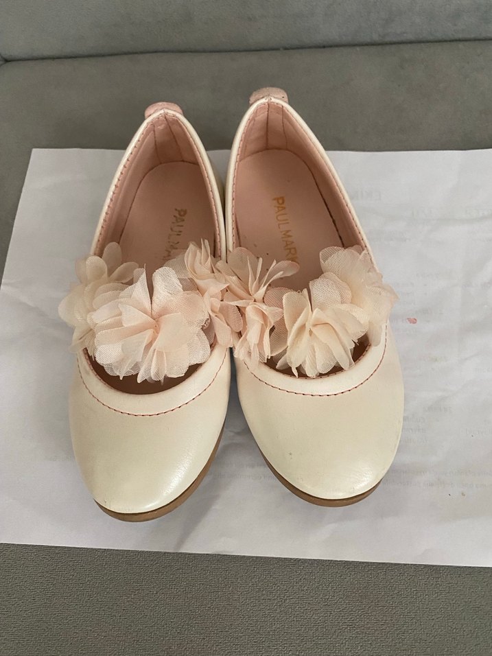 Kız çocukları için bej renkli, çiçek desenli fırfır detaylı ve kauçuk tabanlı klasik ve modern tarzda babettir.