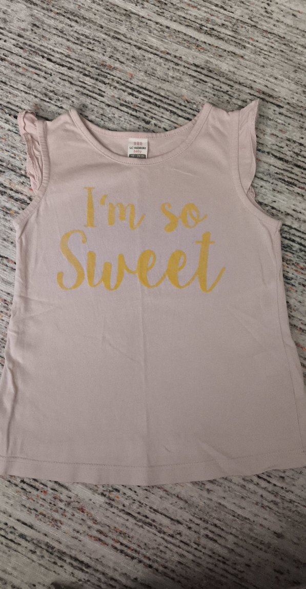 Kolsuz, bej renkli, fırfırlı detaylı kız çocuk tişörtü. "I'm so Sweet" yazılı baskısı ve yumuşak sentetik kumaşıyla rahat sokak stili için uygundur.