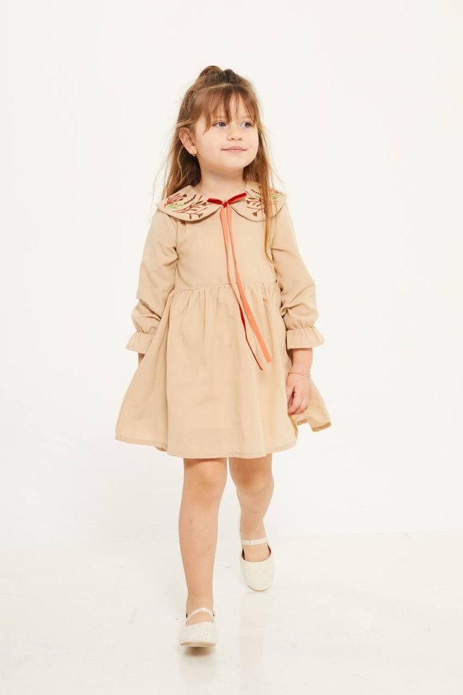 Kız Çocuk Bej Fırfırlı Uzun Kollu Elbise