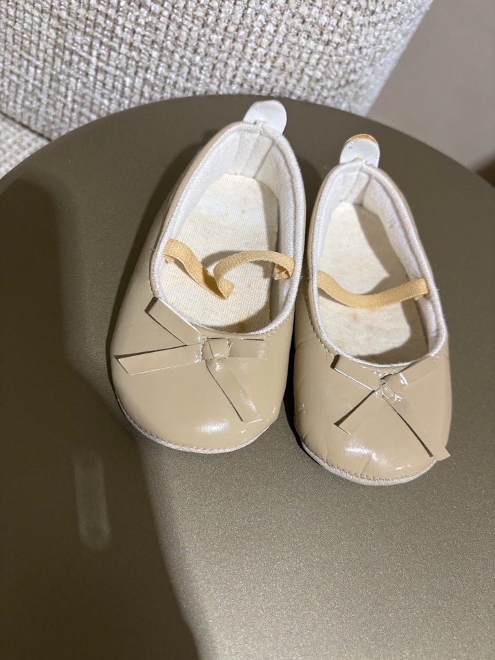 Bej renkli, fiyonk detaylı kız çocuk babeti. Lastik malzemeden üretilmiş, desen içermeyen klasik tasarım.alt taban ölçüsü 12,5 cm dir.