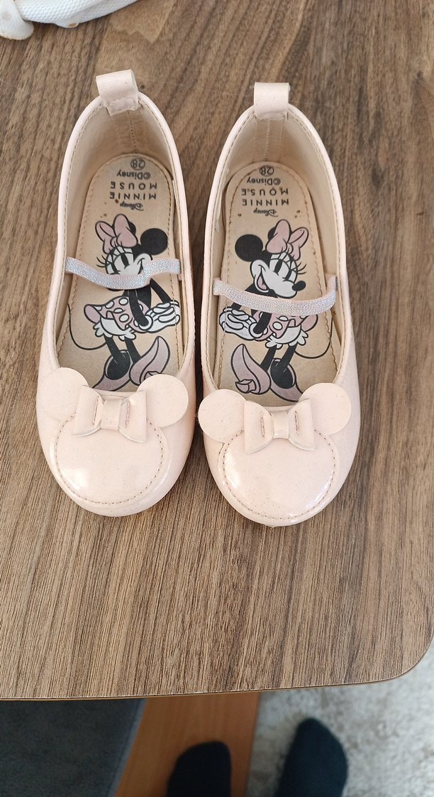 Bej renkte, Minnie Mouse baskılı iç tabanlı, tokalı bantlı ve kauçuk tabanlı kız çocuk babeti.